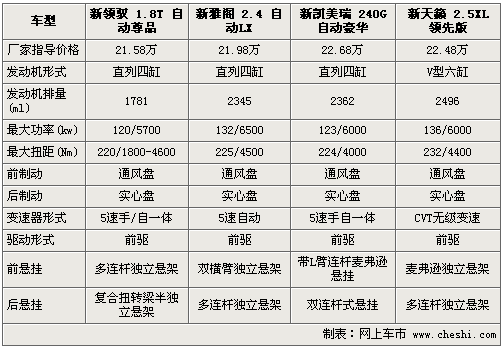 在動(dòng)力性能方面,由于新天籟搭載了2.5排量V型六缸引擎,所以動(dòng)力性能較其它三款車的直列四缸引擎更加澎湃?v觀三款同級(jí)日系車型的發(fā)動(dòng)機(jī)排量均在2.4升左右,而新領(lǐng)馭發(fā)動(dòng)機(jī)排量?jī)H為1.8升,并且采用渦輪增壓技術(shù),在一定程度上較其它三款日系車的燃油經(jīng)濟(jì)性更高。在變速箱方面,新天籟配備的CVT無(wú)級(jí)變速箱換擋更加平順和舒適,而新領(lǐng)馭和新凱美瑞的5速手/自一體變速器較新雅閣搭載的5速自動(dòng)檔變速器更具駕駛樂(lè)趣。