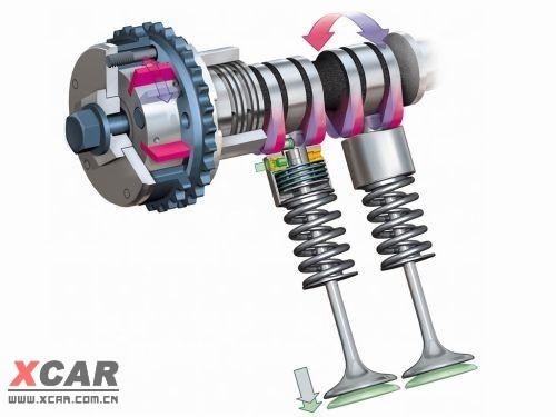 以上所述發(fā)動機可變氣門正時系統(tǒng),是通過微機控制可變氣門調(diào)節(jié)器上升和下降獲得齒形皮帶輪與進氣凸輪(進氣門)的相對位置變化,這種結構屬于凸輪軸配氣相位可變結構,一般可調(diào)整20!30。曲軸轉(zhuǎn)角。由于這種機構的凸輪軸、凸輪形線及進氣持續(xù)角均不變,雖然高速時可以加大進氣遲閉角,但是氣門疊開角卻減小,這是它的缺點。