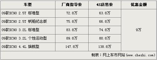 據(jù)沃爾沃經(jīng)銷商處銷售人員介紹,目前店內(nèi)的09款XC90車型全系都有9萬元的現(xiàn)金優(yōu)惠,并且此次優(yōu)惠活動截止到7月1日。經(jīng)優(yōu)惠后,2.5T標(biāo)準(zhǔn)型的售價跌破70萬元,僅售63.8萬元。2.5T 帆船紀(jì)念版經(jīng)9萬元優(yōu)惠后,售價從75.8萬元下降到了66.8萬元。兩款3.2L排量車型經(jīng)優(yōu)惠后售價降為74.8萬元及80.8萬元,頂配的4.4L旗艦車型售價降為了138.8萬元。銷售人員還介紹,XC90全系車型齊全,消費(fèi)者挑選的空間較大。