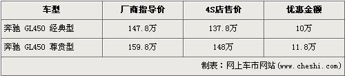 據(jù)經(jīng)銷商處銷售人員介紹,目前國內在售的奔馳GL級分為GL450 經(jīng)典版與GL450 尊貴版,近日奔馳GL系的最高優(yōu)惠金額增到了11.8萬元。經(jīng)優(yōu)惠后,低配車型的經(jīng)典版售價降為了137.8萬元,跌破了140萬,高配的尊貴版經(jīng)全系最高的10萬元優(yōu)惠后,車型售價也降為了148萬元,首次跌破150萬元。