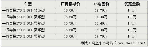 新款B50的上市搶了老款B70不少風(fēng)頭,目前各家銷(xiāo)售人員均表示北京個(gè)各展廳內(nèi)09款奔騰現(xiàn)車(chē)充足,現(xiàn)在購(gòu)車(chē)的消費(fèi)者將最高享受到1.1萬(wàn)元元現(xiàn)金優(yōu)惠。據(jù)了解,此車(chē)型銷(xiāo)售較快的型號(hào)主要是2.0L的導(dǎo)航版車(chē)型,以及2.3L高配的兩款車(chē)型。優(yōu)惠后的價(jià)格在12.78萬(wàn)-17.78萬(wàn)元之間。