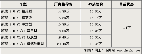 據(jù)4S店銷(xiāo)售人員介紹,目前購(gòu)買(mǎi)凱旋可以?xún)?yōu)惠1.1萬(wàn)元,目前現(xiàn)車(chē)主要都是自動(dòng)檔車(chē)型,主要有黑色、灰色可供選擇,而手動(dòng)精英型和手動(dòng)尊貴型則需要接受預(yù)訂,訂金為1000元,10個(gè)工作日可提車(chē)。