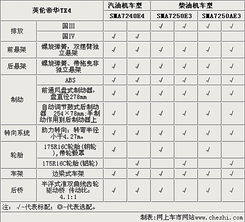 英倫TX4的柴油版只達(dá)到國Ⅲ的排放標(biāo)準(zhǔn),而汽油版車型卻達(dá)到了國Ⅳ排放標(biāo)準(zhǔn)。這款車型采用雙擺臂獨(dú)立前懸架,拖曳臂非獨(dú)立后懸架,制動系統(tǒng)采用前通風(fēng)盤式,后鼓式制動器。TX4采用175R16C的輪胎,不過低配車型卻只配備鋼輪轂。