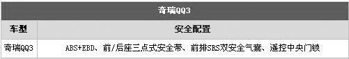 作為老資格的QQ3在安全方面沒(méi)有讓我們失望,從表中我們看到QQ3配備ABS+EBD,這在微型車中也是非常出眾的配置。靈活機(jī)動(dòng),價(jià)格低廉,油耗較低是QQ3最大的優(yōu)點(diǎn)。由于QQ3只是一款微型車,內(nèi)部空間不是很寬敞,并非全部符合國(guó)內(nèi)消費(fèi)者主流家庭轎車的選擇標(biāo)準(zhǔn),不過(guò)在配置方面,QQ3相比以前有很大提高,其舒適型車配備了動(dòng)力轉(zhuǎn)向、電動(dòng)門窗、電動(dòng)后視鏡、真皮座椅、CD和中央門鎖等。