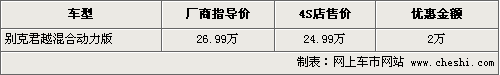 據(jù)4S店銷售人員介紹,目前購(gòu)買(mǎi)君越混合動(dòng)力車(chē)型最高可以優(yōu)惠現(xiàn)金2萬(wàn)元,原來(lái)指導(dǎo)售價(jià)為26.99萬(wàn)元,優(yōu)惠后售價(jià)為24.99萬(wàn)元,相當(dāng)于導(dǎo)航版車(chē)型的價(jià)格。目前經(jīng)銷商處有黑色的現(xiàn)車(chē)供應(yīng)。