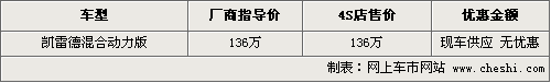 筆者從凱迪拉克北京地區(qū)經(jīng)銷商處了解到,目前凱雷德混合動力版車型已經(jīng)到店,現(xiàn)車主要為黑色。據(jù)銷售人員介紹,混合動力版車型只有白色和黑色兩款車,現(xiàn)在白色款還需要預(yù)訂,售價為136萬,現(xiàn)車暫無優(yōu)惠。