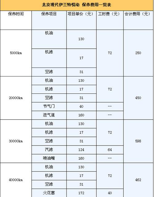 悅動(dòng)的首保為5000km,以后每次的保養(yǎng)間隔為5000km。保修政策為2年/6萬公里保修(以先到為準(zhǔn))。第二次的10000km保養(yǎng)和首保內(nèi)容相同。那么如果一年行駛2萬km,悅動(dòng)一年要做四次保養(yǎng)。由下表可知其除了第一年,以后每年的保養(yǎng)費(fèi)用1500元。