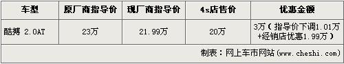 根據(jù)4s店銷售人員介紹,目前官方對酷搏 2.0 AT版車型的廠商指導價下調(diào)了1.01萬元,下調(diào)后廠商指導價從23萬元降到了21.99萬元,并且在店內(nèi)購車的消費者還可以得到經(jīng)銷店送出的1.99萬元的優(yōu)惠。經(jīng)總優(yōu)惠后,道奇酷搏的售價降到了20萬,F(xiàn)車方面,店內(nèi)酷搏現(xiàn)車不多,錯過的消費者只能交1萬元訂金,下個月才可提車。