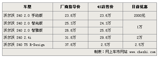 據(jù)4S店銷(xiāo)售人員介紹:目前沃爾沃S40優(yōu)惠幅度相比之前有所減少,2.0手動(dòng)車(chē)型僅優(yōu)惠2000元,2.0 DSG車(chē)型最高優(yōu)惠1萬(wàn)元,2.4車(chē)型與2.5T車(chē)型都達(dá)到2萬(wàn)元的優(yōu)惠。不過(guò)目前手動(dòng)車(chē)型無(wú)現(xiàn)車(chē),訂車(chē)需等一個(gè)月。2.5T車(chē)型也較少,顏色并不齊全。相對(duì)而言,2.0自動(dòng)檔與2.4車(chē)型現(xiàn)車(chē)較充足。