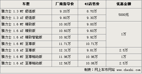雅力士在歐洲是一款非常受歡迎的A0級(jí)小車,但在08年進(jìn)入國(guó)內(nèi)銷售后,其銷量并不樂觀,但是從這款車的配置、安全性方面,仍然是一款值得購(gòu)買的小車。根據(jù)網(wǎng)上車市價(jià)格監(jiān)測(cè)系統(tǒng)顯示,目前這款車最高優(yōu)惠幅度達(dá)到了2.5萬元,其中有少量裝載進(jìn)口發(fā)動(dòng)機(jī)的1.6排量車型仍有銷售,具體行情如下: