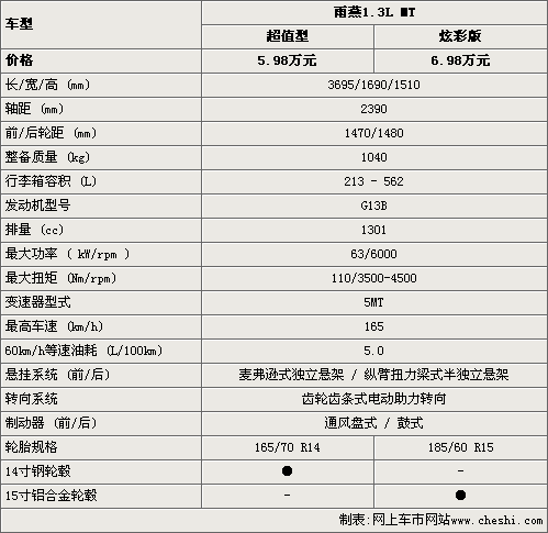 雨燕1.3L超值型的售價為5.98萬元,比炫彩版要便宜一萬元,在車身尺寸和動力性能方面,這款新車都沒有任何變化。但雨燕1.3L超值型只配備了14寸鋼輪轂和14寸輪胎,而炫彩板則配備的是15寸鋁合金輪轂是15寸輪胎?偟膩碚f,雨燕超值型整車的性能基本上并沒有變化。