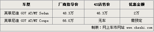 目前銷售的英菲尼迪G37只有四門版車型在售,廠商指導價格為48.3萬元,現(xiàn)在購車可以優(yōu)惠現(xiàn)金2萬元,優(yōu)惠后售價為46.3萬元,店內有銀色等款現(xiàn)車供應,同時兩門版車型尚沒有現(xiàn)車,需要預訂,訂金為1萬元。
