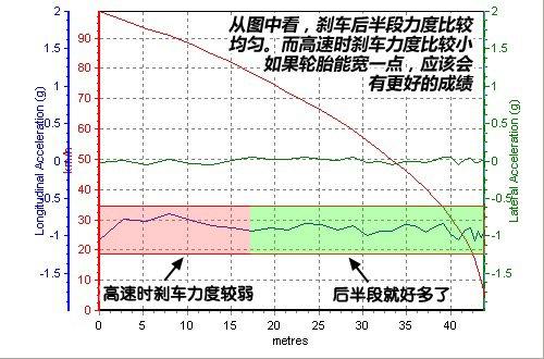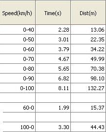 同樣在剎車測試時,205輪胎還是拖了后腿,抓地力實在有限。最終剎車的平均成績是44.4米,這已經是能接受的極限了。如果換上大一號的輪胎,剎車成績能提高到42米左右就比較理想了。