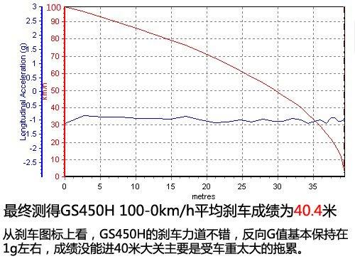 從剎車的工況圖表上看,GS450h的剎車力道始終保持的不錯,反向G值基本保持在1g左右的水平,成績沒能進(jìn)40米大關(guān)主要是受車重太大的拖累。
