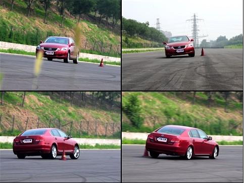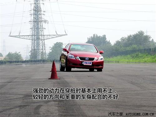 經(jīng)過了城市道路和高速公路上對這款GS450h的體驗(yàn),感覺穿樁測試對于這款車來說應(yīng)該不算是什么難事?烧娴搅藴y試場地上,GS450h的表現(xiàn)并不像我們想象的那樣。這款車的懸掛雖然是可調(diào)的,但即便是運(yùn)動模式,還是有對于舒適性能的考量,懸掛還是有點(diǎn)軟。所以在穿樁這種比較強(qiáng)調(diào)運(yùn)動性能的環(huán)節(jié),車身的側(cè)傾還是顯露出了一些。雖然說因?yàn)榘岩粔K大電池放在了后座的后面,使得GS450h的前后重量比達(dá)到了50:50,但實(shí)際上這款車的操控性并不像那些真正注重運(yùn)動性能的車型的操控性那么優(yōu)秀,方向盤的指向在樁間表現(xiàn)比較輕,動力的跟進(jìn)也還算可以,但后輪在樁間明顯感覺有點(diǎn)笨重,而且車內(nèi)的防滑控制接觸開關(guān)時無法將防滑系統(tǒng)徹底關(guān)閉的,所以在穿樁的過程中防滑控制總是會干預(yù),所以想要開著GS450h在穿樁場地上跑出個很好的成績真不是一件容易的事情,或者說它就不是干這事兒用的。