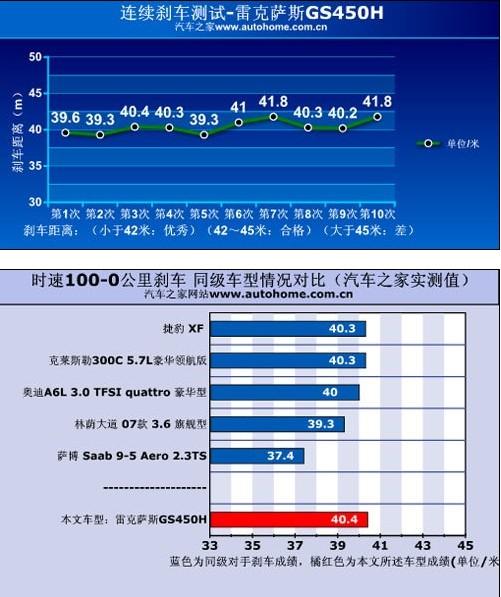 說到剎車,這款GS450h的100-0km/h的平均剎車成績?yōu)?0.4米,如果單從成績來看40.4米已經(jīng)很不錯,但如果考慮到它90萬元的售價(jià),總覺得這么昂貴的車的剎車成績怎么也應(yīng)該在40米之內(nèi)才能讓人滿足。