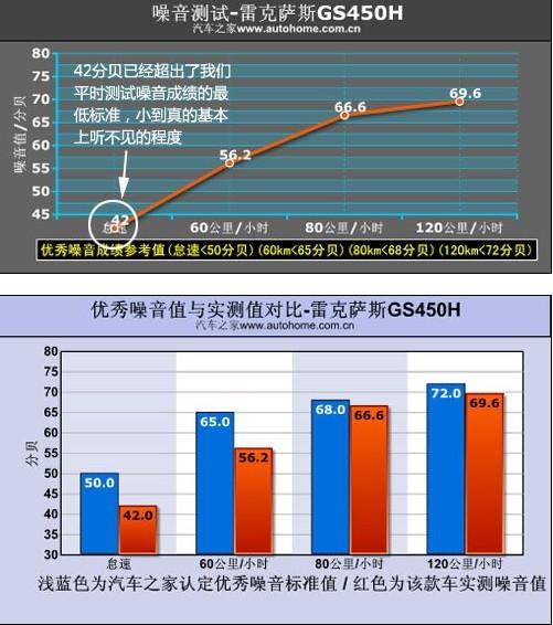 咱們?cè)賮?lái)說(shuō)說(shuō)GS450h的噪音環(huán)節(jié),怠速狀態(tài)下這款車的噪音值為42分貝,這個(gè)成績(jī)已經(jīng)比標(biāo)準(zhǔn)低了很多很多,實(shí)際坐在車內(nèi)基本上什么也聽(tīng)不到,測(cè)試儀測(cè)出的這42分貝的聲音應(yīng)該是屬于人耳很難聽(tīng)到的那種音頻。行駛中的噪音也非常理想,60km/h、80km/h、120km/h時(shí)速下的噪音成績(jī)分別為56.2分貝、66.6分貝、69.6分貝;靹(dòng)車型最大的好處就在于它可以再任何適當(dāng)?shù)臅r(shí)候?qū)⑵桶l(fā)動(dòng)機(jī)關(guān)閉,只靠電動(dòng)機(jī)就可驅(qū)動(dòng)車輪,所以在這種狀態(tài)下行駛時(shí)主要的噪音來(lái)源是風(fēng)噪和胎噪?傮w來(lái)講,GS450h的噪音抑制水平是相當(dāng)高的,而且我們能看的隔音棉這類的隔音設(shè)備也非常規(guī)整且厚實(shí),但通過(guò)技術(shù)層面的改進(jìn)抑制噪音的做法我們必須表示肯定。