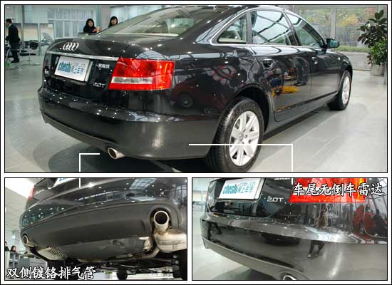 A6L尾部上方由圓潤的流線型改為略微翹起的棱角,具有擾流板的功效,同時(shí)也使尾部造型更顯硬朗和運(yùn)動(dòng)化。在車尾部分“公務(wù)版”A6L的特征在于取消了倒車?yán)走_(dá),但整體造型上左右雙出式的鍍鉻排氣管依然很有氣勢!
