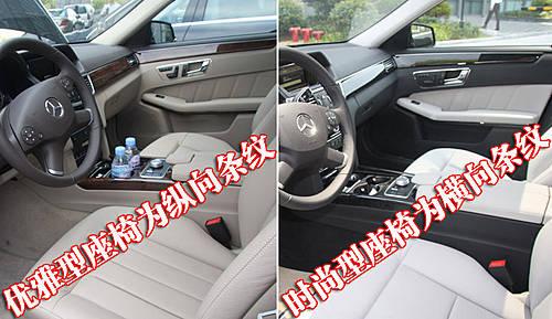 奔馳新E300優(yōu)雅型和時尚型除內(nèi)飾條材質(zhì)差異外,全車真皮坐椅的剪裁也略有差異。奔馳新E300優(yōu)雅型作為入門級車型,全車真皮坐椅采用縱向條紋設(shè)計,而奔馳新E300時尚型則采用橫向條紋設(shè)計。