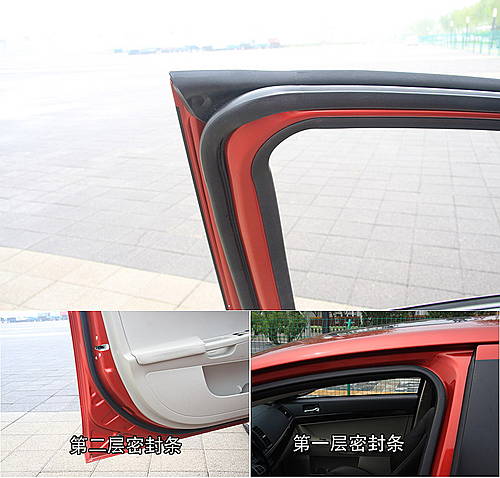 車門密封采用了雙層密封,第二層密封條設計巧妙,它的上半部延伸非常像德系車上采用的第三層密封條。密封條尺寸和歐洲車相仿,和較重的車門匹配很好。
