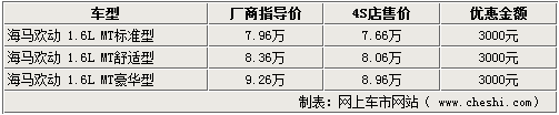 在市場中銷售有段時間的1.6L歡動新車,現(xiàn)已進入各個海馬經(jīng)銷商展廳,現(xiàn)車充足顏色齊全。在售的三款新車均為手動版車型。除直接享受國家1.6L車型的購置稅優(yōu)惠政策外,并有現(xiàn)金3千元優(yōu)惠;銷售人員表示,現(xiàn)金優(yōu)惠也可換為等值的裝飾禮包,同樣超值,F(xiàn)金優(yōu)惠配合購置稅優(yōu)惠,則大大減輕了消費者的購車負擔。
