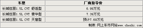 據(jù)悉,長城炫麗CVT將在9月2日上市,首先會推出三款車型,其中1.5L舒適型和1.5L豪華型的售價(jià)分別為6.99萬元和7.39萬元。因?yàn)殪披愜囆鸵恢本蜎]有出天窗版,所以1.5L CVT 天窗版的價(jià)格還不明朗,預(yù)計(jì)在7.69萬元左右。目前炫麗CVT已經(jīng)有部分現(xiàn)車抵達(dá)4S店,但因?yàn)樾萝噦浒冈虿荒苌吓,目前只能夠接受預(yù)訂。