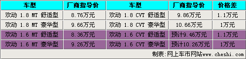 海馬歡動1.6L共有三款車型,其中基本型由于配置低,市場上并沒有銷售,而海馬也不會為這樣一款低配車型匹配CVT變速箱,所以,歡動1.6L CVT可能只有舒適型和豪華型兩款車。從歡動1.8L的手動擋和自動擋的差價可以看到,舒適型相差1.1萬元,而豪華型也相差1萬元。依照海馬歡動的定價規(guī)則,歡動1.6L CVT舒適型和豪華型的價格預(yù)計為9.46萬元和10.26萬元。