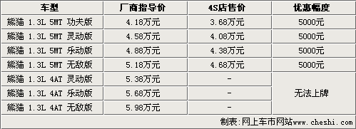 據(jù)吉利汽車4S店銷售人員介紹,熊貓1.3L手動擋車型目前都有現(xiàn)車銷售,而自動擋雖然已經(jīng)上市,但由于北京地區(qū)無法上牌,所以還沒有現(xiàn)車抵達北京市場,預計最早會在今年年底前解決無法上牌的問題。目前熊貓1.3L手動擋全系可以優(yōu)惠五千元,而這款車型還增加了電動升級后窗,需要在原價的基礎上加1000元。