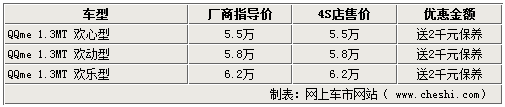 奇瑞在推出QQ家族的新成員QQme后,令經(jīng)典的QQ全系車型再度引起消費(fèi)者的關(guān)注。近日網(wǎng)上車市車市網(wǎng)站由經(jīng)銷商處了解到,新上市不久的QQme雖然沒有現(xiàn)金優(yōu)惠,但是贈(zèng)送價(jià)值2000元的保養(yǎng)卡。