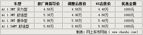 除上文介紹的QQme以及QQ3,奇瑞A1也有更多的優(yōu)惠政策。據(jù)銷售人員介紹,調(diào)整售價后,奇瑞A1目前仍可以優(yōu)惠1000元,但豪華型現(xiàn)車不足,部分顏色需要預訂。而且個別4S店的并沒有豪華型現(xiàn)車,也需要預訂,訂金為2000元。