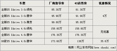 據(jù)經(jīng)銷商處銷售人員介紹,店內(nèi)還有一輛售價(jià)為173.6萬元的08款X5 4.8i豪華版現(xiàn)車,目前此批車有35.6萬元的優(yōu)惠,經(jīng)優(yōu)惠后售價(jià)降到了138萬元。銷售人員還介紹,新款X5-30i車型有4萬元的優(yōu)惠,4.8i車型沒有優(yōu)惠。