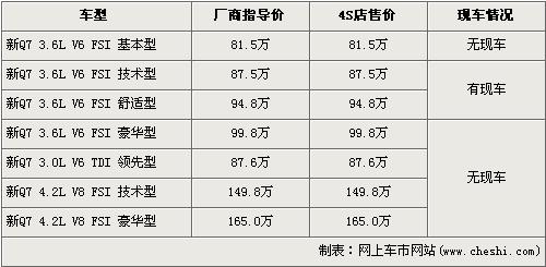 據(jù)北京奧迪4S店銷售人員介紹,新款的奧迪Q7有三個(gè)排量共7款車型,售價(jià)區(qū)間為81.5萬元-165萬元。目前店內(nèi)已經(jīng)到第一批先期預(yù)訂的奧迪新Q7現(xiàn)車,車型為3.6L技術(shù)型和3.6L舒適型,F(xiàn)在欲購買新Q7的消費(fèi)者需交1萬元訂金,下個(gè)月中旬方可提車。