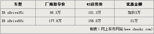 據(jù)北京寶馬經(jīng)銷店銷售人員介紹,現(xiàn)在在售的X6車(chē)型分為售98.3萬(wàn)元的35i車(chē)型和售價(jià)為177.8萬(wàn)元的50i兩款車(chē)型。店內(nèi)沒(méi)有35i車(chē)型的現(xiàn)車(chē),消費(fèi)者需要交訂金10萬(wàn)元,待店內(nèi)到車(chē)后提現(xiàn)車(chē)還要加價(jià)3萬(wàn)元,售價(jià)從98.3萬(wàn)元上升到了100.3萬(wàn)元,排量更大的4.4升的50i車(chē)型有21萬(wàn)元的現(xiàn)金優(yōu)惠,售價(jià)降到了156.8萬(wàn)元。銷售人員還介紹,50i車(chē)型現(xiàn)車(chē)店內(nèi)也不多,欲購(gòu)買(mǎi)的消費(fèi)者需加快購(gòu)買(mǎi)腳步。