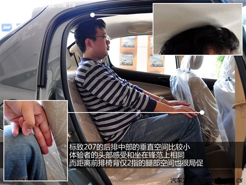 坐在標致207后排兩邊的正常座位上,體驗者頭部距離車頂僅兩指,這不太符合基本舒適性的要求,但也可以忍受。而腿部空間的表現(xiàn)可以被接受,頭枕的可調高度很符合安全性及舒適性的綜合標準。