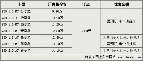 據(jù)北京現(xiàn)代北京地區(qū)4S店銷售人員介紹,現(xiàn)代i30因上市不久,新車貨源比較緊張,但現(xiàn)在已有少量1.6及2.0頂配車型現(xiàn)車到店,顏色以紅色、銀色為主。其余車型預(yù)訂最快半個月可提車,訂金為5000元。北京地區(qū)各4S店由于訂單不同,各店銷售的現(xiàn)車顏色有所不同。