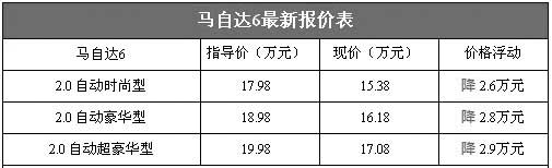 馬自達(dá)6是一款非常經(jīng)典的車型,現(xiàn)在更是憑借著突出的性價(jià)比持續(xù)熱銷。昨日,我們從北京地區(qū)的一些一汽馬自達(dá)汽車綜合經(jīng)銷商處了解到,近期馬自達(dá)6的價(jià)格穩(wěn)定,降幅在2.8萬(wàn)元左右,其中馬自達(dá)6 2.0自動(dòng)時(shí)尚型目前的售價(jià)為15.38萬(wàn)元,性價(jià)比非常不錯(cuò)。以下是馬自達(dá)6最新詳細(xì)報(bào)價(jià)表:
