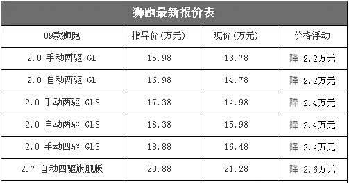 09款獅跑上市后,價格迅速下降,因此月銷量能夠穩(wěn)定在4000輛左右。我們昨日從北京地區(qū)一家東風悅達起亞獅跑經(jīng)銷商處了解到,近期獅跑部分車型的優(yōu)惠再次增加2000元,最高降幅已經(jīng)增至2.4萬元,性價比再次提升。目前獅跑最低配車型2.0手動兩驅舒適版的售價為13.78萬元,和歷史最低價持平,和競爭對手途勝售價非常接近。以下是09款獅跑最新詳細報價表: