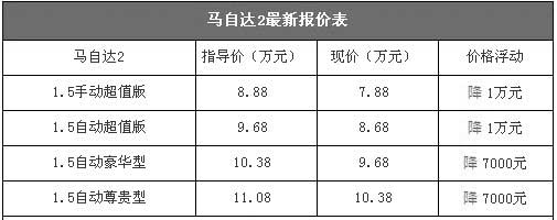 今年4月初,長(zhǎng)安馬自達(dá)推出了兩款馬自達(dá)2超值版車型,使得馬自達(dá)2 1.5L排量的最低售價(jià)降至8.88萬(wàn)元,對(duì)于購(gòu)車預(yù)算在9萬(wàn)元以內(nèi)的朋友來(lái)說(shuō),又多了一款選擇的車型。近日,我們從北京地區(qū)的一家長(zhǎng)安馬自達(dá)汽車綜合經(jīng)銷商處了解到,目前馬自達(dá)2 1.5L最高可優(yōu)惠1萬(wàn)元,其中超值版最低配售價(jià)已經(jīng)降至7萬(wàn)元區(qū)間,性價(jià)比和新嘉年華相比高出不少。以下是馬自達(dá)2最新報(bào)價(jià)表:
