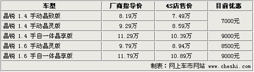 據(jù)4S店銷售人員介紹:目前晶銳全系最高優(yōu)惠達9000元,最低僅售7.49萬。晶銳目前各店內現(xiàn)車較少,只有個別車型有現(xiàn)車,如需預定需等待1個半月時間。價格方面,如到店內洽談可獲得更高優(yōu)惠。1.4升手動車型優(yōu)惠幅度,由原來的6000元增至7000元,而1.4升與1.6升自動擋車型已優(yōu)惠9000元,相比之前的6000元增幅達33.3%。