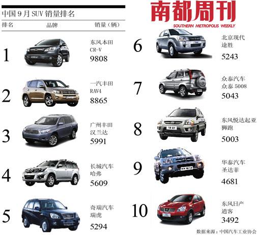中國9月SUV銷量排名