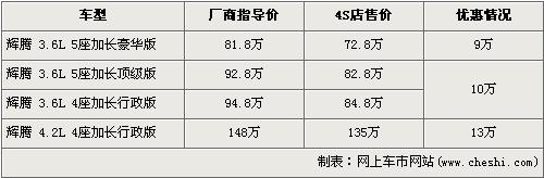 據(jù)北京進(jìn)口大眾經(jīng)銷店銷售人員介紹,目前輝騰3.6L 5座加長(zhǎng)豪華版有9萬元的現(xiàn)金優(yōu)惠,經(jīng)優(yōu)惠后3.6L 5座加長(zhǎng)豪華版的售價(jià)降到了72.8萬元。排量稍大的4.2L 4座加長(zhǎng)行政版有13萬元的優(yōu)惠,經(jīng)優(yōu)惠后售價(jià)從148萬元下降到了135萬元。銷售人員還介紹,4.2L輝騰沒有現(xiàn)車,欲購(gòu)買的消費(fèi)者需交訂金10萬元預(yù)訂。