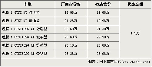 據(jù)北京一汽大眾經(jīng)銷店銷售人員介紹,邁騰全系車型全系優(yōu)惠1.3萬元。經(jīng)1.3萬元的優(yōu)惠后,全系入門級的1.8TSI MT時尚型的售價(jià)從18.98萬元下降到了17.68萬元。全系最高配的邁騰2.0TSI豪華版經(jīng)1.3萬元優(yōu)惠后,售價(jià)降到了25.08萬元。銷售人員還介紹,目前邁騰全系現(xiàn)車都比較充足。