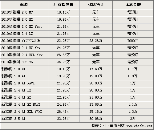 據(jù)4S店銷售人員介紹,目前部分2010款百萬紀(jì)念版雅閣新車已經(jīng)到店,消費(fèi)者購車的話可以優(yōu)惠7000元。其他款車型還需要預(yù)訂,訂金為2000元,F(xiàn)在店內(nèi)08款車型最高可優(yōu)惠現(xiàn)金3萬元,入門級(jí)車型優(yōu)惠現(xiàn)金7000元,以2.0手動(dòng)檔為例,優(yōu)惠后僅首17.49萬。現(xiàn)在店內(nèi)有黑色、銀色等可供消費(fèi)者選擇。