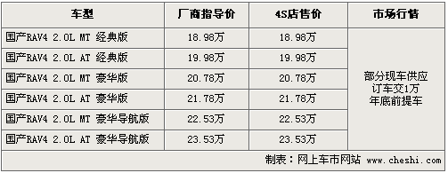 據(jù)一汽豐田北京地區(qū)4S店銷售人員介紹,目前該車有部分車型少量現(xiàn)車,由于RAV4貨源比較緊張,大部分車型及顏色消需要提前預定,訂車需要等待2個月的時間,也就是要到年底前才可以提到現(xiàn)車。如果著急購買,需加價現(xiàn)金一萬元或在4S店購買等值的裝飾,F(xiàn)車顏色以黑色、白色、銀色為主。北京地區(qū)各4S店由于訂單不同,各店銷售的現(xiàn)車顏色有所不同。