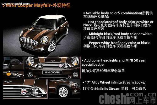 MINI 50 Mayfair紀(jì)念版車型在配置上較MINI Cooper 1.6高配車型有所提升,運(yùn)動(dòng)真皮方向盤、電動(dòng)折疊外后視鏡、發(fā)動(dòng)機(jī)艙蓋褐色飾條、倒車?yán)走_(dá)及自動(dòng)大燈控制等均稱為MINI 50 Mayfair紀(jì)念版車型標(biāo)準(zhǔn)配置。