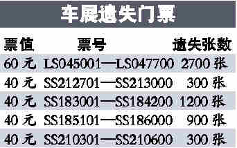 這5400張車展門(mén)票是在19日晚間遺失的,車展主辦方已經(jīng)報(bào)案。涉及面值分別有60元和40元兩種,各有2700張。