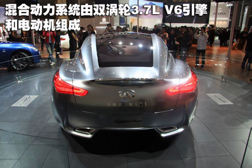 圍著這輛英菲尼迪斥巨資打造的GT跑車轉(zhuǎn)上一圈,你會驚嘆它是如此的低矮,如此的修長。環(huán)繞整個車身的腰線,華麗的曲面,將流暢的全景天窗車頂與尾部銜接得天衣無縫。 它那長得有些夸張的引擎蓋,完全是為了承載一部動力強(qiáng)勁到足以與法拉利Scuderia叫板的混合動力系統(tǒng)。一臺標(biāo)準(zhǔn)的3.7升V6自然吸氣汽油機(jī),加裝了雙渦輪,最大功率躥升至324千瓦。當(dāng)并聯(lián)的混合動力系統(tǒng)滿負(fù)荷工作時,Essence概念車可以獲得442千瓦的驚人動力。