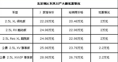 近日,筆者從東風(fēng)日產(chǎn)北京經(jīng)銷店了解到,新天籟2.5車型最高將優(yōu)惠2.2萬,并且4S店有現(xiàn)車,提車速度較快,這對那些準(zhǔn)備出手新天籟的北京朋友的確是一個(gè)好消息。