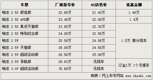 目前銳志的在價格優(yōu)惠方面基本和11月保持一致,其中入門級舒適版優(yōu)惠1.48萬,最低售價為21.40萬,2.5真皮版以及天窗版等優(yōu)惠1.5萬元,部分店內(nèi)還推出了贈送保險等相應活動。而3.0排量一直沒有現(xiàn)車供應,還需要訂車。銳志全系車型較多,一般購買車型主要集中在舒適版和紀念版,消費者可根據(jù)需要選購。