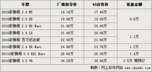 據(jù)廣州本田4S店銷售人員介紹,目前老款雅閣車型已停產(chǎn),銷售車型均為2010款。頂級車型購買可優(yōu)惠3萬元,2.0自動檔標(biāo)配可優(yōu)惠8千元,F(xiàn)在店內(nèi)現(xiàn)車比較緊張,大部分車型顏色需要預(yù)訂,訂金為2000元。如消費(fèi)者有意購買,到店詳談會有更優(yōu)惠的價格。北京地區(qū)各4S店由于訂單不同,各店銷售的現(xiàn)車顏色有所不同。